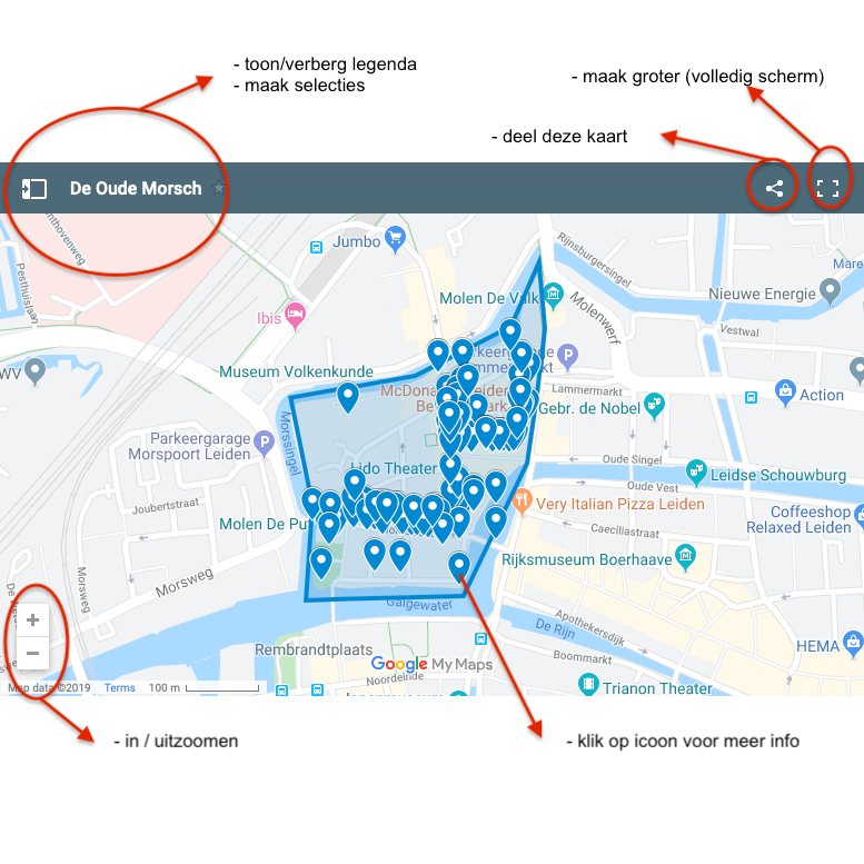 Uitleg bij bovenstaande kaart. Dit is een kaart gemaakt in Google Maps. Als je wijzigingen of toevoegingen hebt, stuur een bericht aan webmaster@deoudemorsch.nl